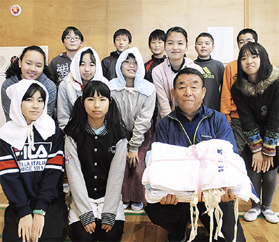 6年1組では地域との関係を深めようと、防災をテーマに1年間総合学習に取り組んできた。その中で地域の高齢化や道が狭いことによる大規模火災のリスクなどを把握。自分たちにできることとして、家庭科の学習を活かした今回の防災頭巾贈呈につながった。