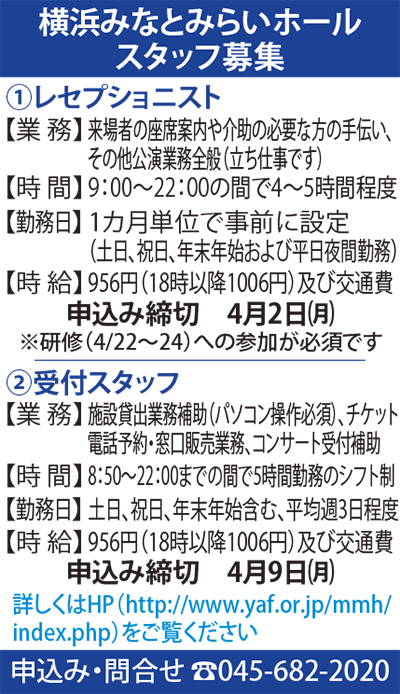 クイーンズスクエア横浜内にある横浜みなとみらいホールでは、公演時に接客などを行う「レセプショニスト」とチケット販売業務などを担う「受付スタッフ」を現在募集している。