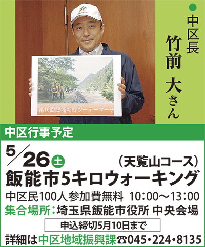 都市間交流の一環として、中区と交流事業を実施している埼玉県飯能市では、16回目となる人気のウォーキングイベント「飯能新緑ツーデーマーチ」を5月26日と27日に行います。そこで、飯能市の好意で26日、通常参加費1500円の5Kmコースに中区民100人を無料招待していただきました。現在、参加者を募集しています。