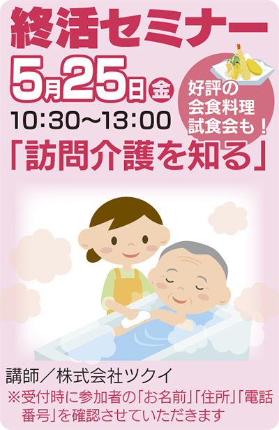 西区の家族葬ホール「ラステル久保山」で5月25日(金)、(株)ツクイのスタッフを講師に招き「訪問介護を知る」と題した無料終活セミナーが開かれる。時間は午前10時30分から午後1時まで。