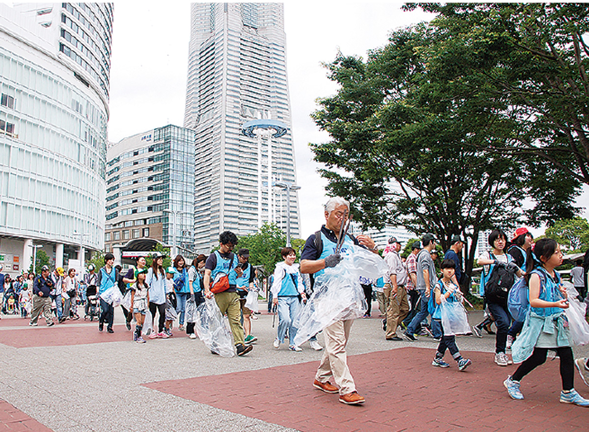 清掃ボランティア団体の「I Love Yokohama」をはじめ、近隣の企業など13団体、約660人がJR桜木町駅前に集合。ごみ袋とトングを手に大通り公園石の広場をめざして、各コースでごみ拾いに汗を流した。