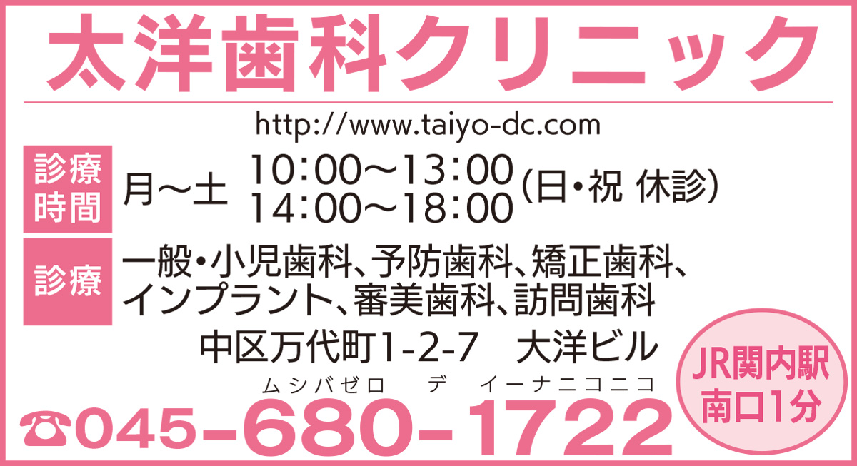 JR関内駅南口すぐの「太洋歯科クリニック」では一般歯科や小児歯科、予防歯科のほか、顎関節症、見えない矯正歯科、マウスピース、イビキ治療、インプラント、訪問診療まで幅広く対応。歯型要らずのセラミック治療(セレック3D)が当日2時間ほどでできる数少ない医院だ。