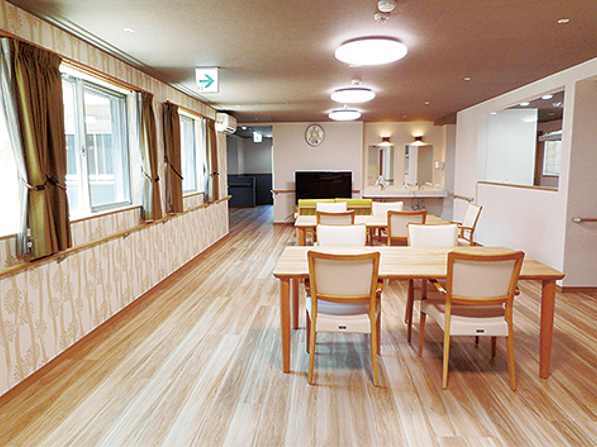 静かな住宅街の一角にある同施設は、外観から内装までを地域に溶け込む色使いでトータルコーディネート。生活の場として落ち着いた内装や家具が整えられている。