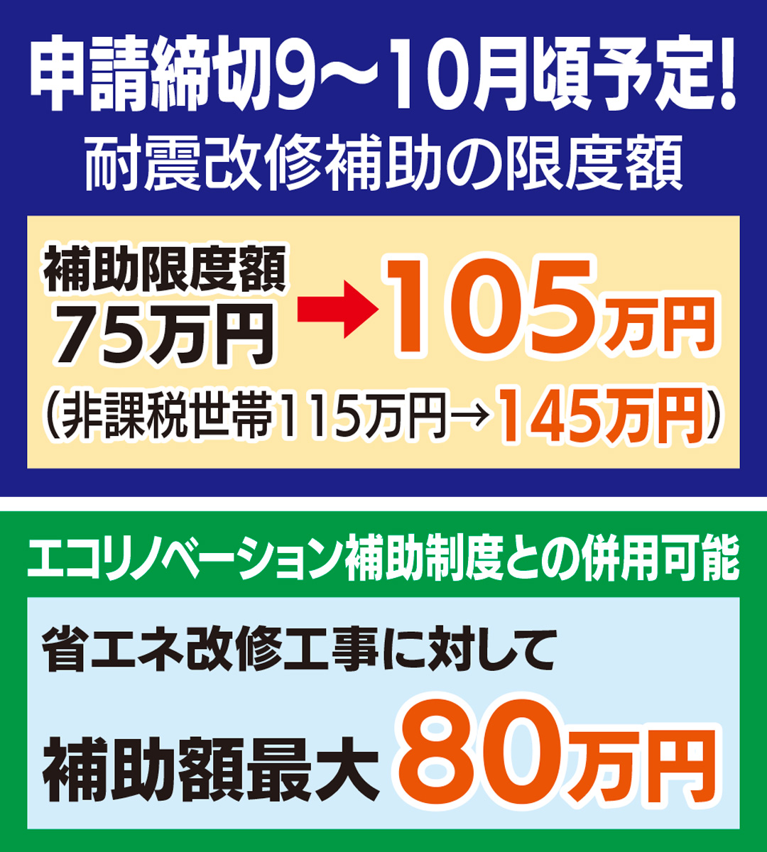 市内には旧耐震の木造住宅が多く、過去の地震の被害状況からも耐震化をより一層進める必要がある。そこで、市民の耐震化の検討を後押しするため、2018年度末までに工事が完了する場合に限り、限度額75万円(非課税世帯は115万円)の耐震改修補助を30万円増額。限度額を105万円(非課税世帯145万円)に引き上げている。
