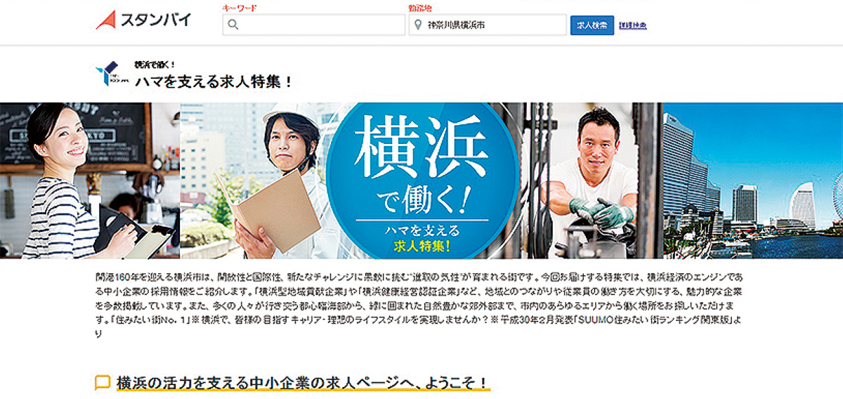 市内中小企業の人材確保支援の一環として横浜市は先月末から、(株)ビズリーチが運営する求人検索サイト「スタンバイ」に特集ページを開設した。無料で求人情報を掲載することにより中小企業の採用活動をサポートしていく考えだ。