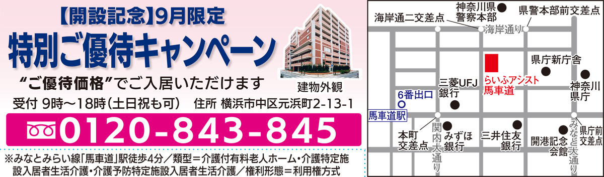 今なら9月限定「特別ご優待キャンペーン」として、通常の入居一時金より割引された”優待価格”で入居ができる。合わせて随時見学会を実施。見学・資料請求を希望の人は、【フリーダイヤル】0120・843・845へ。