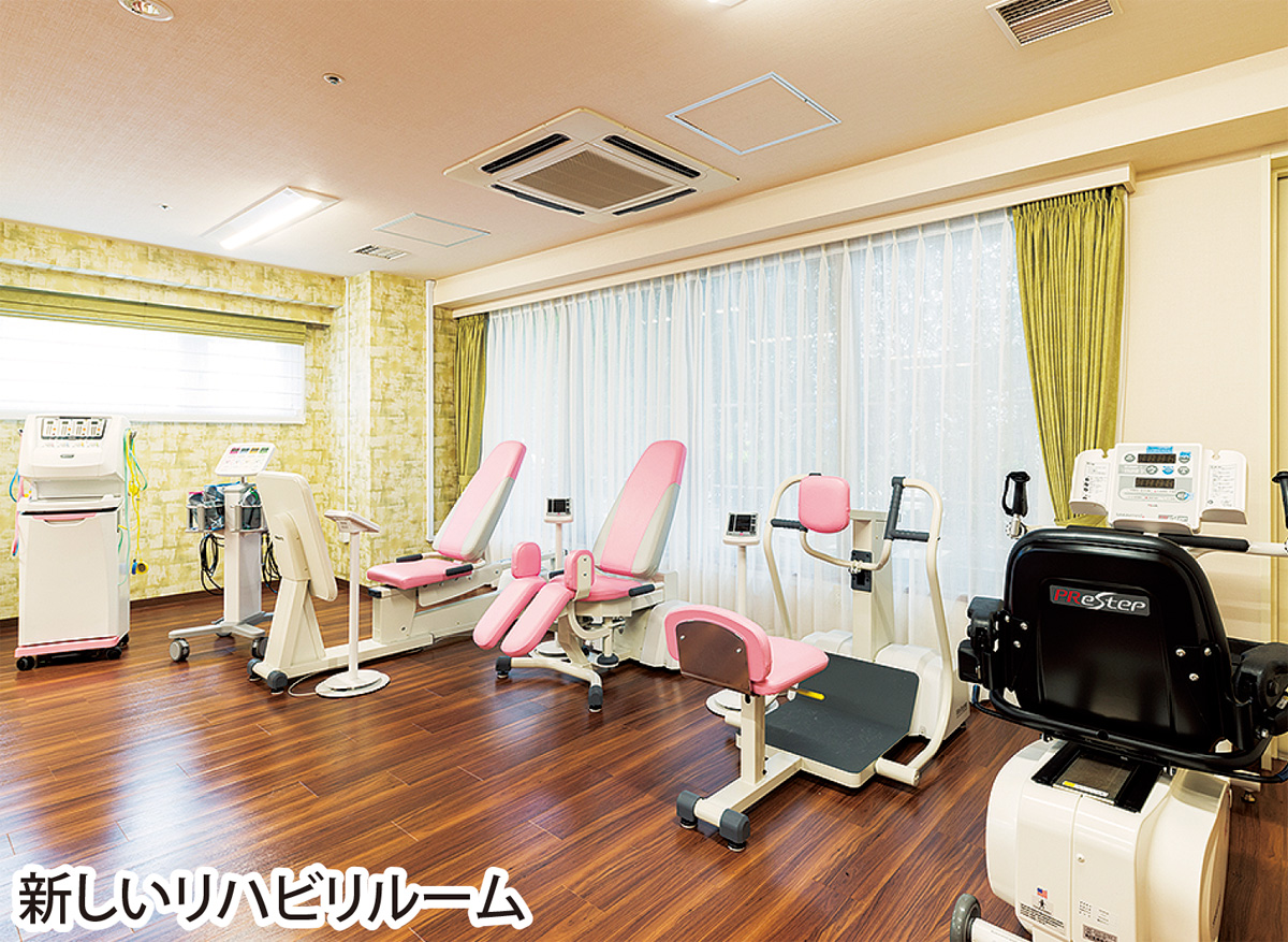「モデルルーム」はより洗練され、快適さに磨きのかかった空間に。気に入ればその居室に入居することもできる。また「リハビリルーム」も一新。最新のリハビリ機器や温熱・電気治療器などを揃え、常勤の理学療法士が一人ひとりの状態に合わせたリハビリをサポートする。