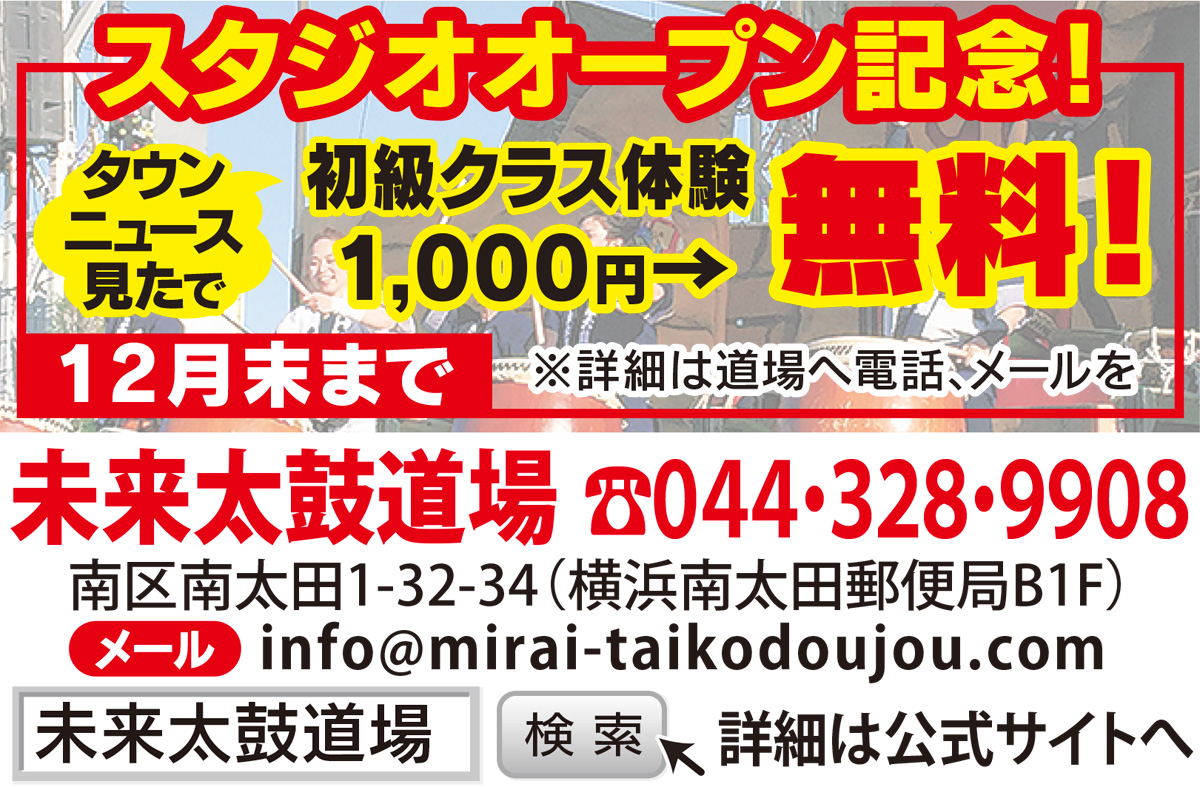 国内外で活躍中のプロ和太鼓集団「梵天(ぼんてん)」主催による和太鼓教室「未来太鼓道場」が南太田・ドンドン商店街に11月、誕生する。東京・神奈川で25年の実績があり、生徒総数は500人を超える。