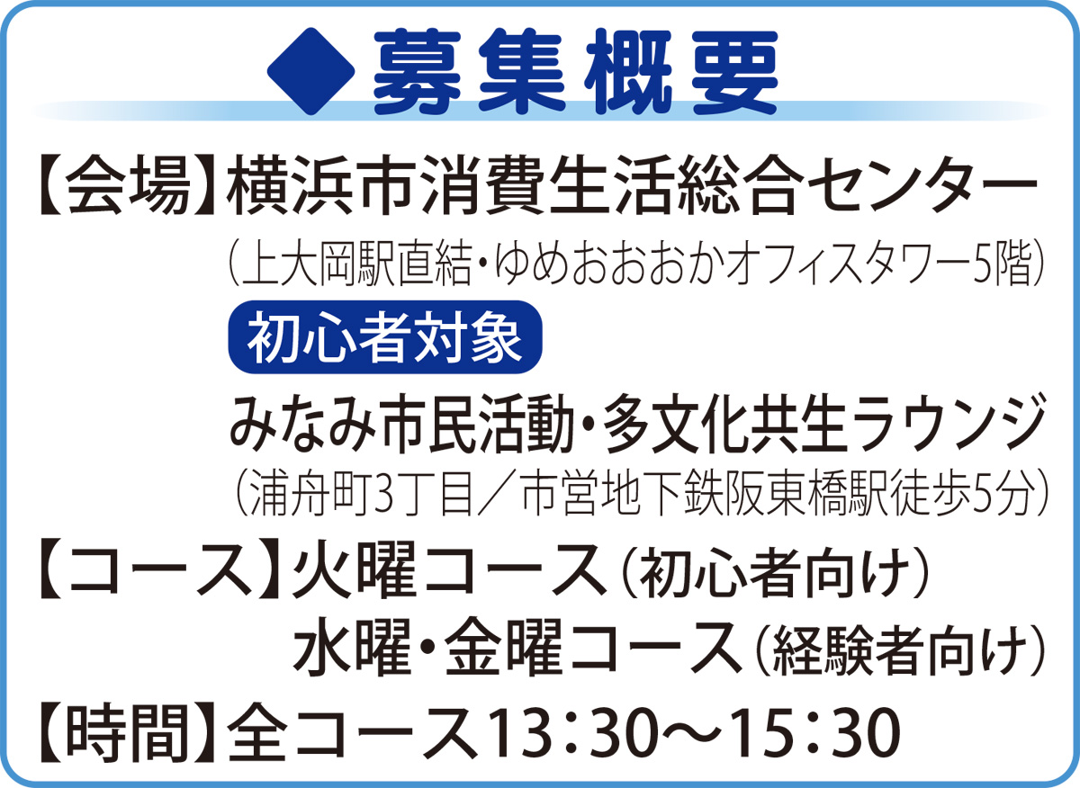 教室は上大岡の消費生活総合センターと南区浦舟町の2カ所。初心者向けの【1】火曜コースと、ワードやエクセルを中心に学ぶ経験者向けの【2】水曜【3】金曜コースの3コース。期間は1〜2年。デジカメ撮影会など課外活動も活発だ。ボランティアによる指導で月謝は月3回で3000円と格安(別途入会金2000円)。ただし、ノートパソコン(ウィンドウズ8以降)の持参が条件。申込は奥野さん【電話】045・844・7560。「PCサロンひまわり」で検索。