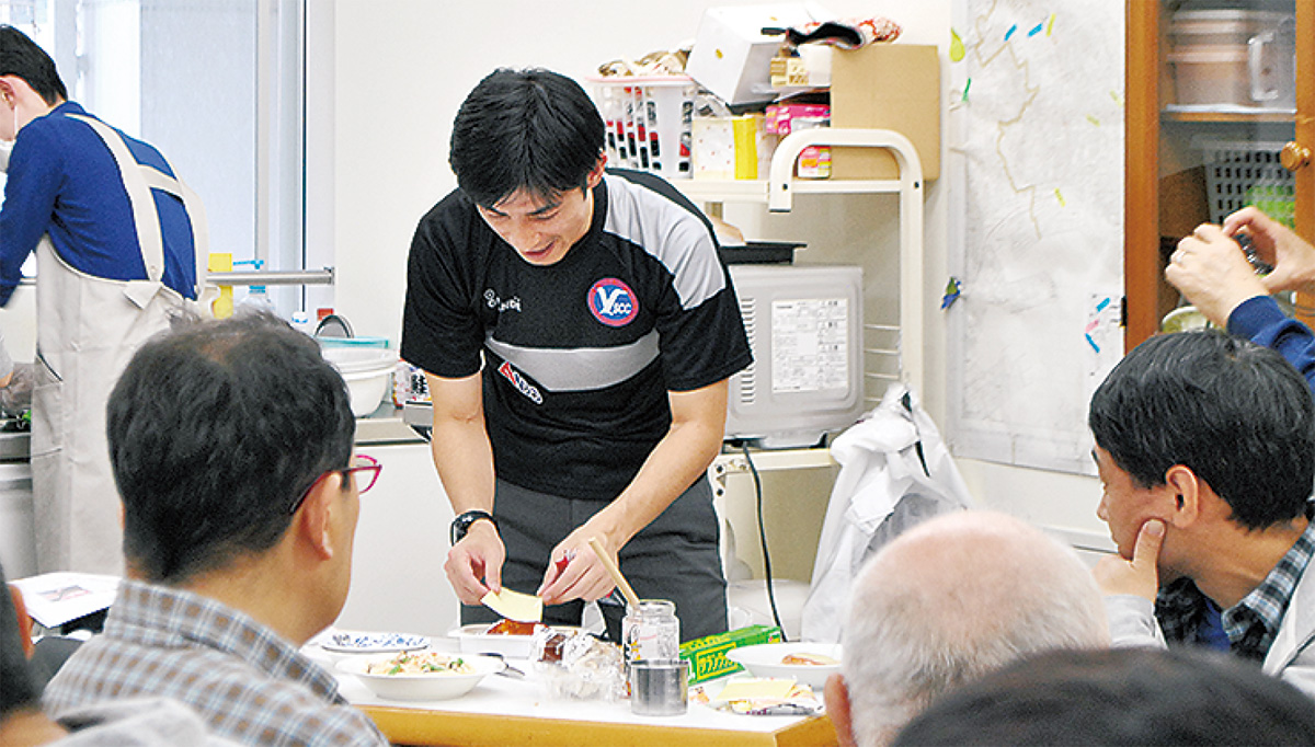 11月8日に中区寿地区の住民を対象とした、サッカーJ3チームYSCCの管理栄養士である岡田和也さん=人物風土記で紹介=が講師を務める料理講座が寿町総合労働福祉会館で行われ、Jリーグの米田惠美理事らが視察に訪れた。この視察はJリーグが掲げている「社会連携」を同講座が実践しているということで、実施された。