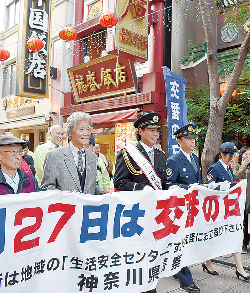 委嘱式終了後には、防犯協会や防犯指導員連絡協議会をはじめ山下町町町内会ほか関係団体のメンバーとともに同署管内である中華街の大通りを合同でパトール。濱口選出は工藤署長や防犯協会の高木正俊会長らとともに先頭に立ち、中華街を練り歩いた。