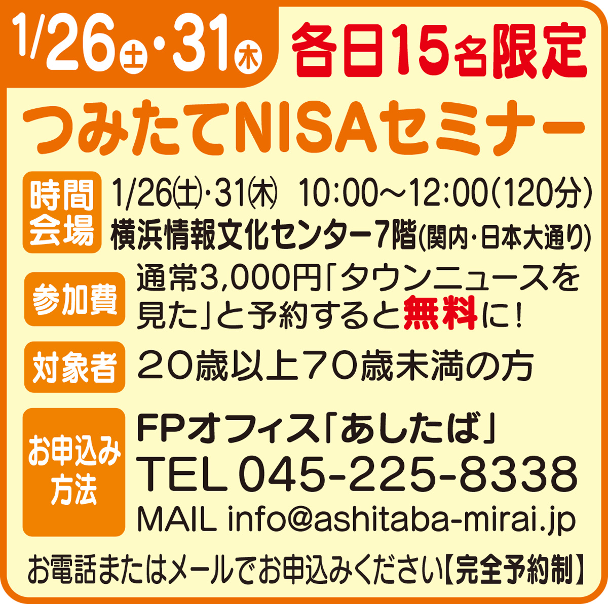今話題の「つみたてNISA」。じぶん年金づくりを国が応援する少額投資非課税制度だ。非課税期間が20年で「コツコツと老後資金を増やしたい」人にぴったり。「制度概要や注意点から投資の基礎まで学べるので、初心者でも安心してご参加ください」と安藤氏。先着予約制のため、お早めに。