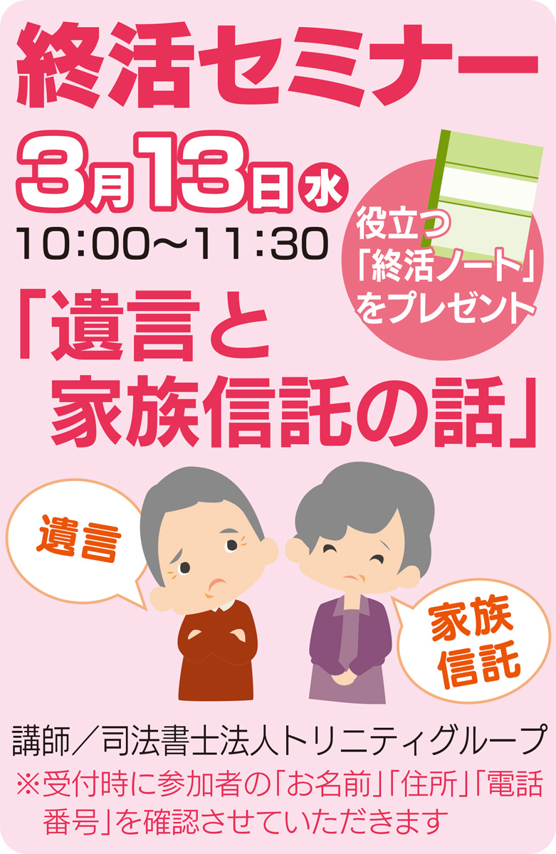 西区の家族葬ホール「ラステル久保山」で3月13日(水)、「遺言と家族信託の話」がテーマの無料終活セミナーが開かれる。時間は午前10時から11時30分まで。