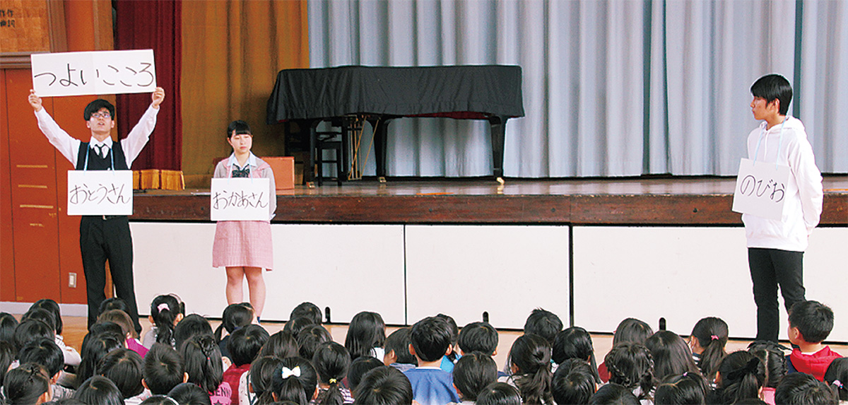 横浜立野高校生徒会(江尻優穂会長)が3月20日、間門小学校で1年生142人に向けて非行防止教室を開いた。