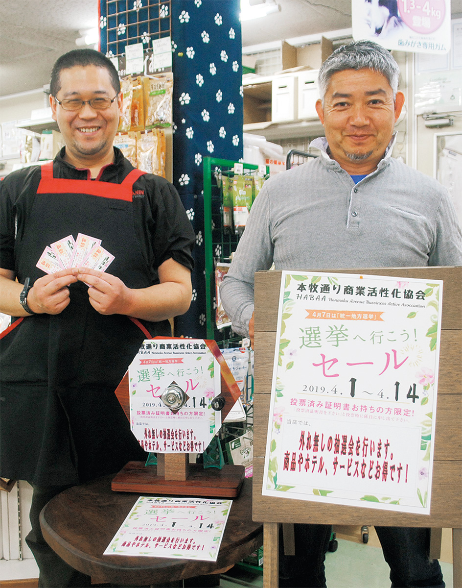 期間は投票日の4月7日から14日までだが、中には期日前投票中の4月1日から実施するところもある。HABAA会長代行でミリオンペット店長の大久保芳樹さんは「若い人や選挙に行かない人を後押しするために、商店街として何ができるか考えた。HABAAとしても今後いろいろなことをやっていきたい」と話した。