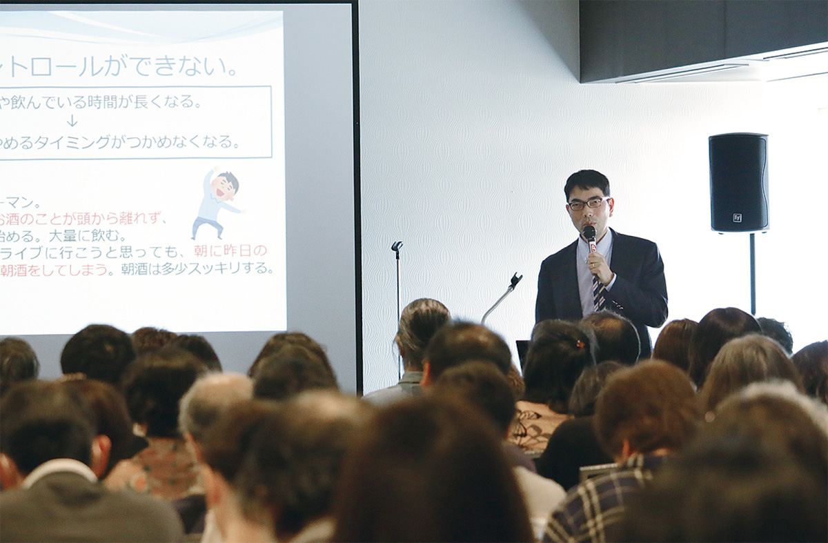 講演では東京アルコール医療総合センターの垣渕洋一センター長が登壇し、「依存症は意思ではなく健康問題。責めるのでなく温かいケアが必要」として、あるべき支援について話した=写真。