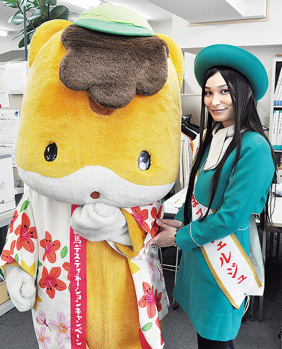 群馬県とJRグループが2020年4月から6月に展開する大型観光企画「群馬デスティネーションキャンペーン(DC)」を盛り上げようと、県のマスコットキャラクター「ぐんまちゃん」とPR役の「ぐんまコンシェルジュ」が3月22日、タウンニュース社を訪れた。
