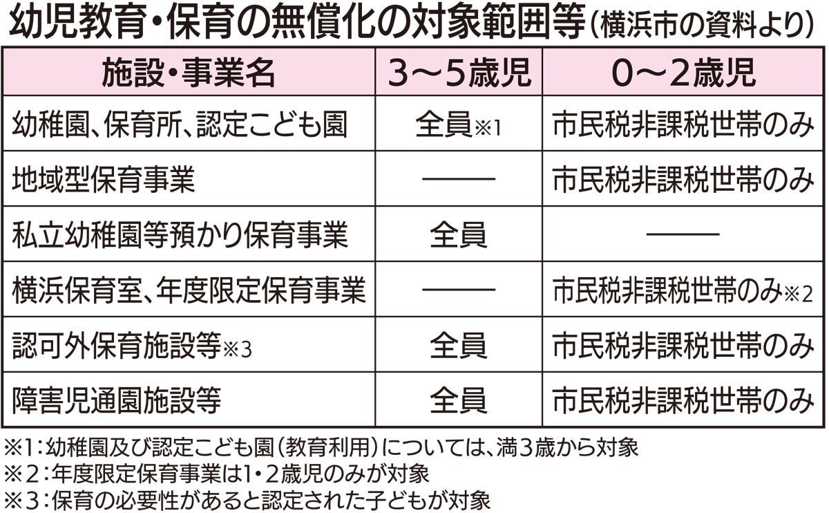 0歳〜2歳児については市民税非課税世帯を対象に無償化。認可外保育施設等は同世帯を対象に月額4万2千円を上限に助成する。