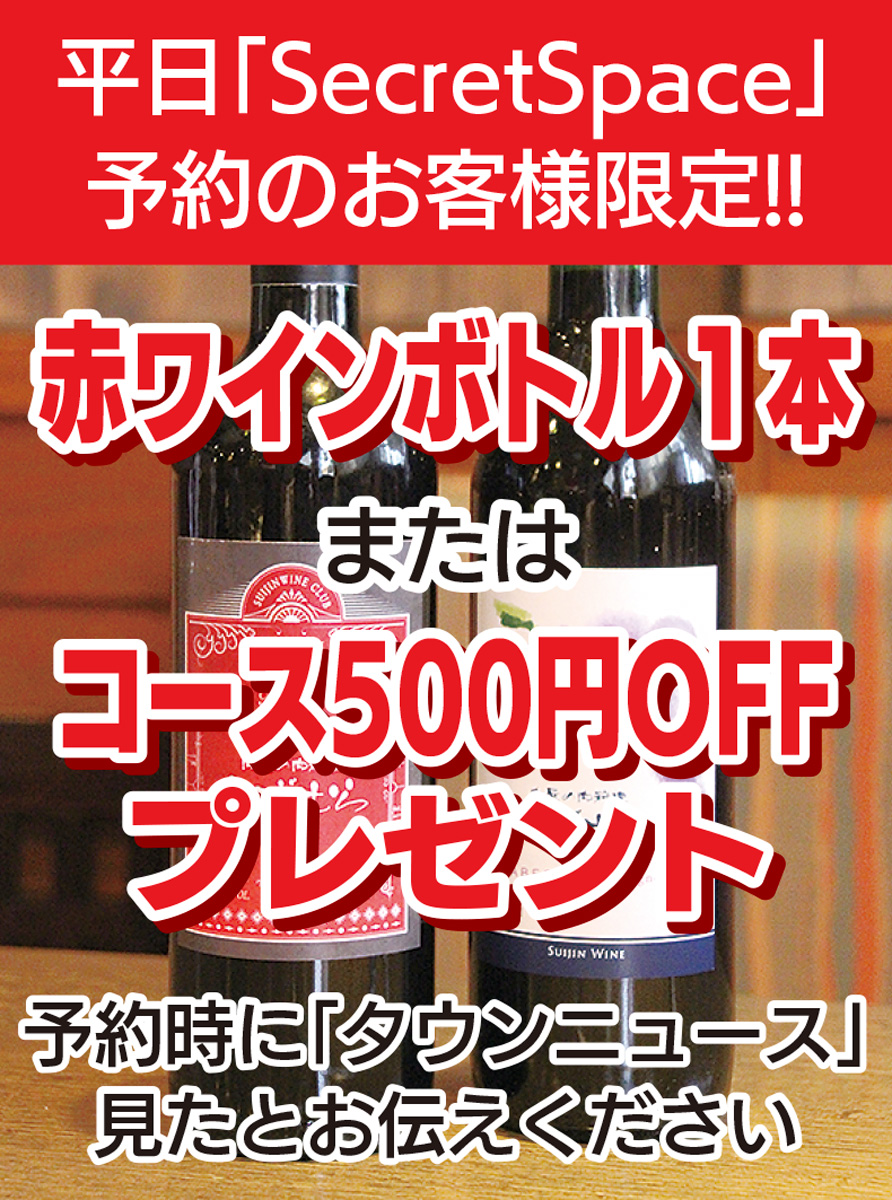 読者限定で赤ワインボトル1本かコース500円オフ!