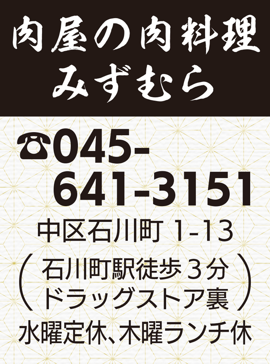 石川町駅徒歩3分にある肉屋の肉料理みずむら(水村嘉宏代表)は、黒毛和牛を手軽に楽しめる肉料理屋。創業1947年から90年まで肉屋を経営してきたノウハウで水村代表自ら肉の脂の乗りサシ具合を目利き。卸業者を通さず直で仕入れるため、極上の黒毛和牛が手軽に提供できる。水村代表は日本料理老舗「瀬里奈」の六本木本店で修業経験をもち、本格的な肉料理が楽しめると好評。