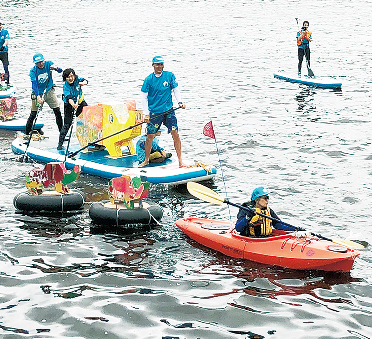 当日は、親水階段から湾内へ入り、カヤックやサップで子象のオブジェをえい航した。新村さんは「来場者には、色とりどりの子象が水上をパレードする新しい景色を楽しんでもらえたのではないか」と話した。