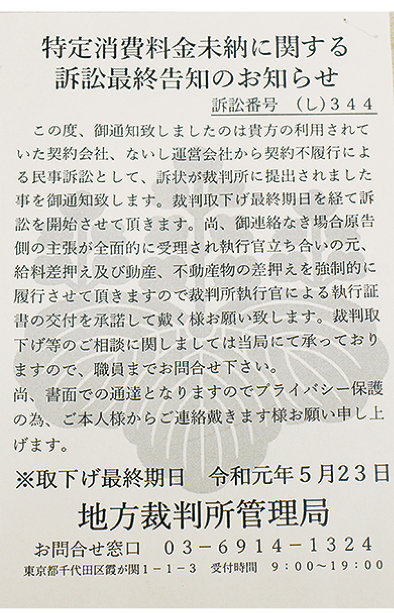 はがきの送り主は「地方裁判所管理局」や「民事訴訟管理センター」など。一見すると公的機関のようだが、いずれも実在しない機関の名義だ。身に覚えがないからと問い合わせると、「あなたに訴えが提起されている」と告げられ、取下げ費用10万円(一例)の支払いを求められる。応じるとさらに各種名目で200万〜300万円の費用を請求されるケースが多い。