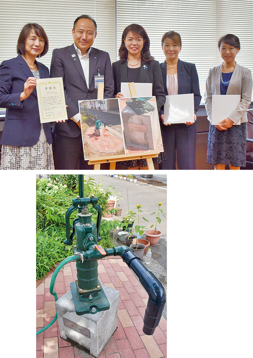 井戸の寄贈は、同法人会女性部会の創設40周年記念事業の一環。今年2月に立野小学校に設置され、名称は児童から公募し「おたすけ井戸」と命名された。