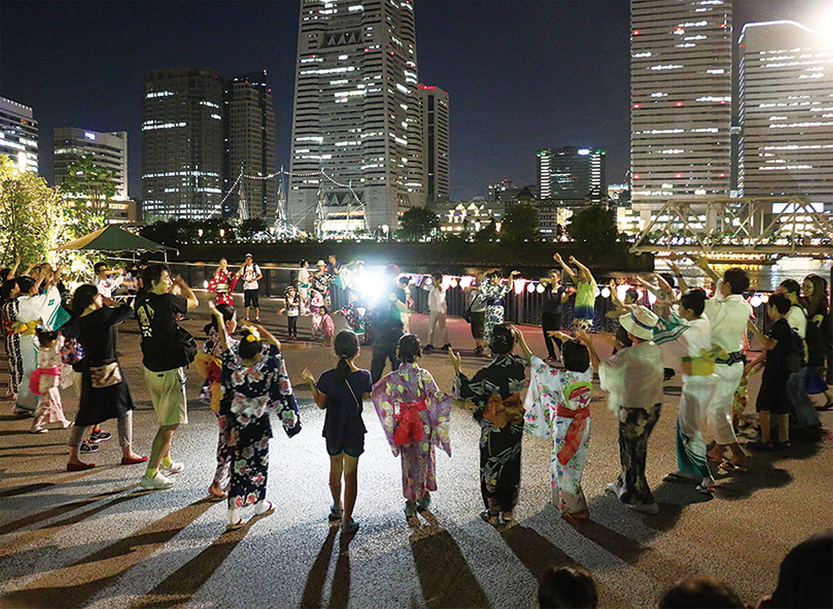 国際色豊かな街の魅力が詰まったプログラムとして盆踊り第1部(午後6時30分)、2部(8時)のほか、大迫力の「三宅太鼓」(5時)、横浜市歌をサンババージョンで踊る「サンバ盆踊り」(5時30分)、アフリカ音楽の「サリウ・ニング」(6時)なども。金魚すくいやスイカ割り、カキ氷なども楽しめる。