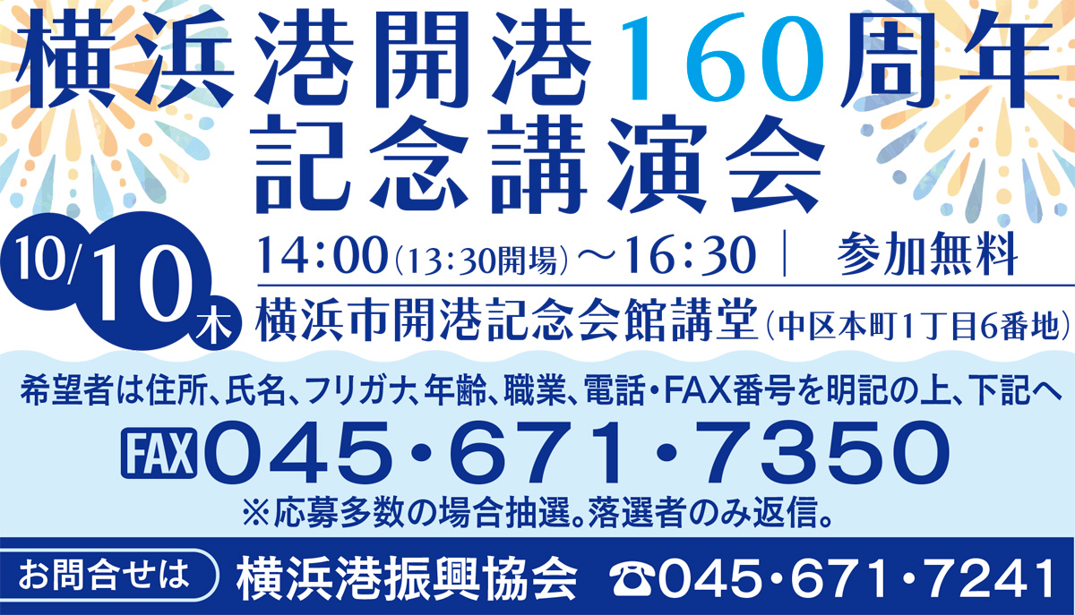 「横浜港開港160周年記念講演会」が10月10日(木)、中区本町の開港記念会館講堂で行われる。(一社)横浜港振興協会(POPヨコハマ)の主催。