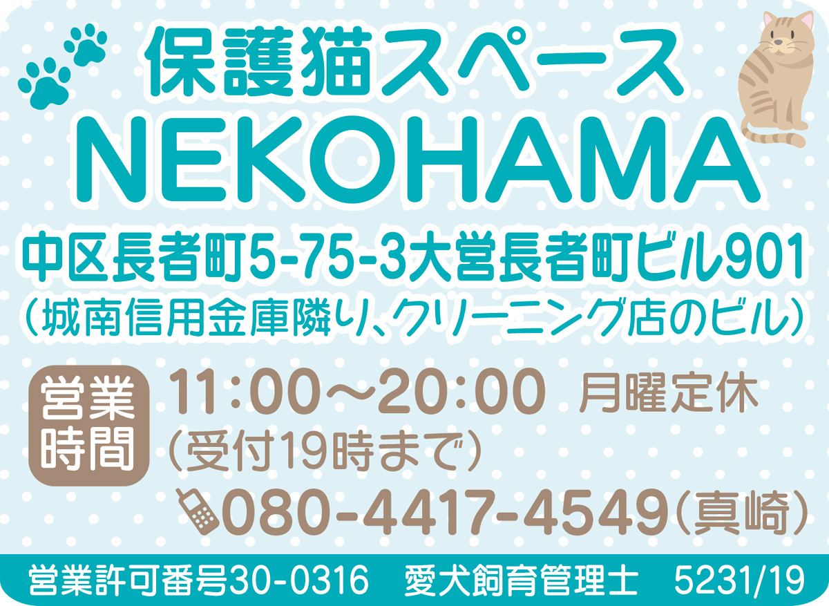 野良猫や事情で飼えなくなった猫の家族探しを行う保護猫スペース「NEKOHAMA(ネコハマ)」が、このほど中区長者町にオープンした。