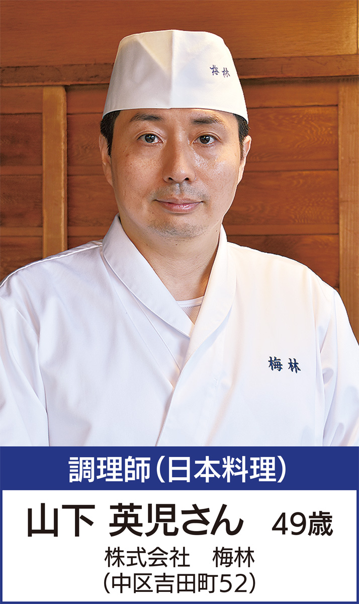 普段は創業77年、中区吉田町の日本料理・梅林の三代目店主を務める。祖父母が馬車道で飲食店をはじめ父が磯料理の店に。そして28歳で継いだ山下さんが、より和の素材にこだわる日本料理店に進化させてきた。