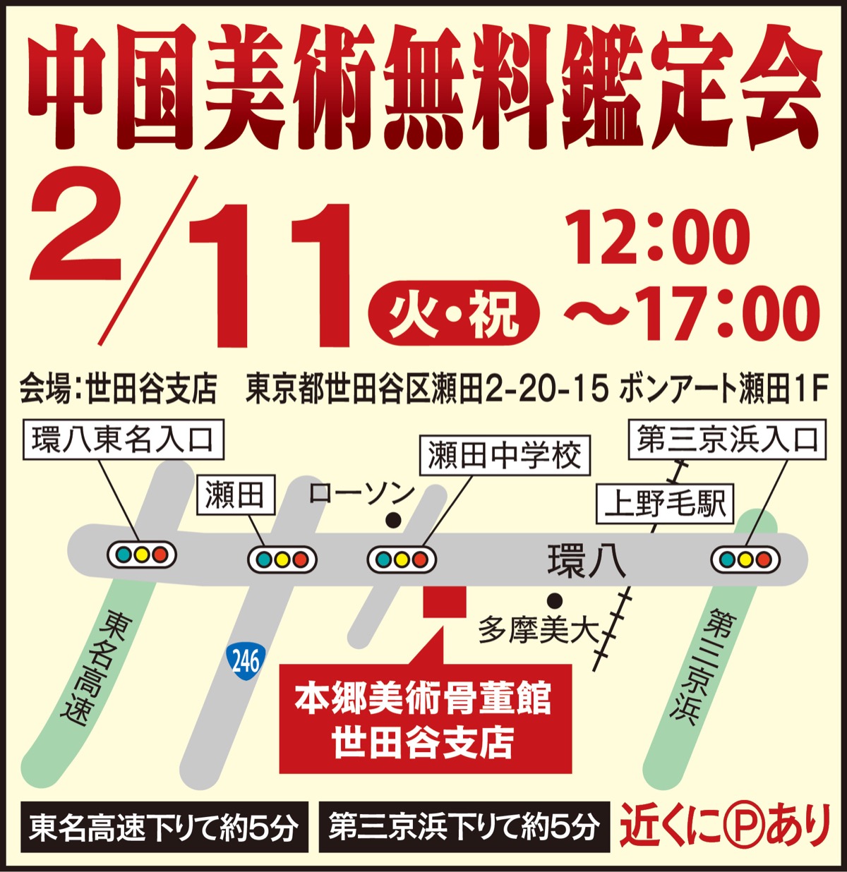本郷美術骨董館 世田谷支店では2月11日(火・祝)、中国美術無料鑑定会を開催する。同店は東大赤門前で創業40年になる骨董品や古美術品の専門店。経験豊富な各分野の鑑定士が27人も在籍し、さまざまな提案を行ってくれる。掛け軸、絵画、茶道具、古美術品等あらゆるジャンルに対応できるのも魅力。TVや新聞、雑誌にも数多くとりあげられているので安心だ。特に中国美術の買取りを強化している。気軽に問い合わせを。
