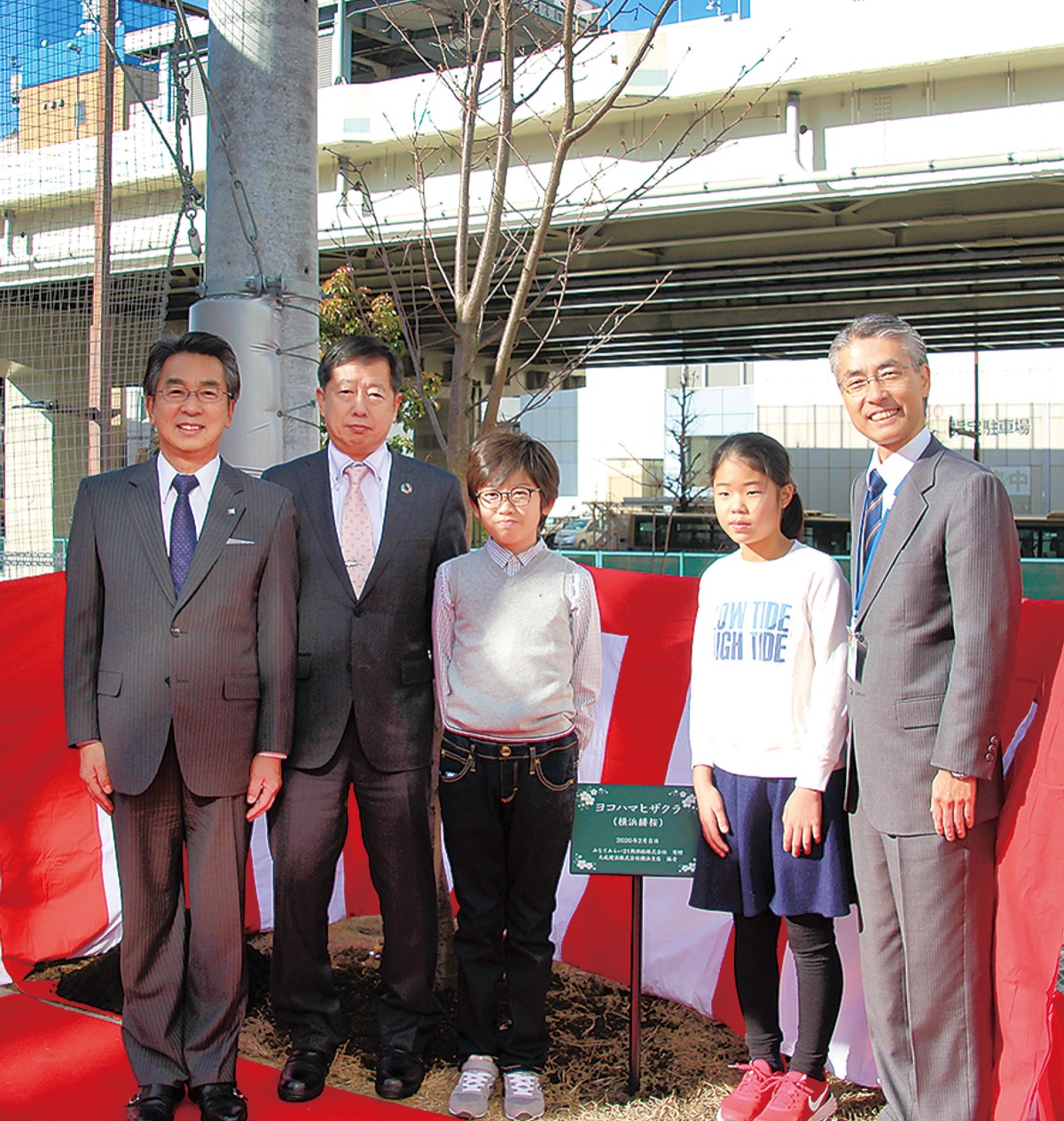 「子どもたちに地元への愛着を持ってほしい」と内田社長の願いで横浜の地名が付いた「ヨコハマヒザクラ」を3本寄贈。児童が通学時に利用する西側の校門近くに植えられた。3月中旬ごろに鮮やかな赤色の花が咲く見通しだ。