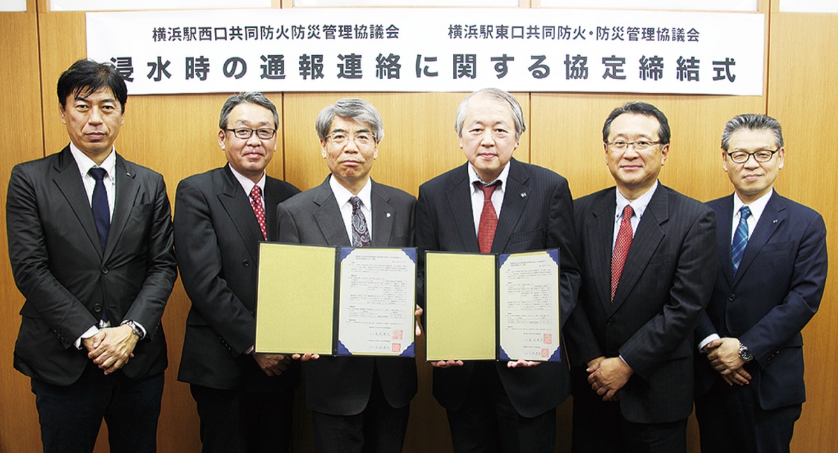 横浜駅西口共同防火防災管理協議会(西口共同防管/森村幹夫会長)と横浜駅東口共同防火・防災管理協議会(東口共同防管/小林秀年会長)は3月19日、浸水時の相互通報連絡に関する協定を横浜新都市センター(株)本社=西区高島=で結んだ。21事業所が属する西口共同防管と8事業所からなる東口共同防管が協定を結ぶのは初めて。