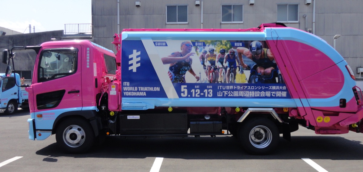 横浜型地域貢献企業でプレミアム表彰を受けた横浜環境保全株式会社(高橋義和代表取締役)は、CSR活動の一環で地域の子どもたちなどが描いた絵を乗せたゴミ収集車「デザインパッカー車」を走らせている。