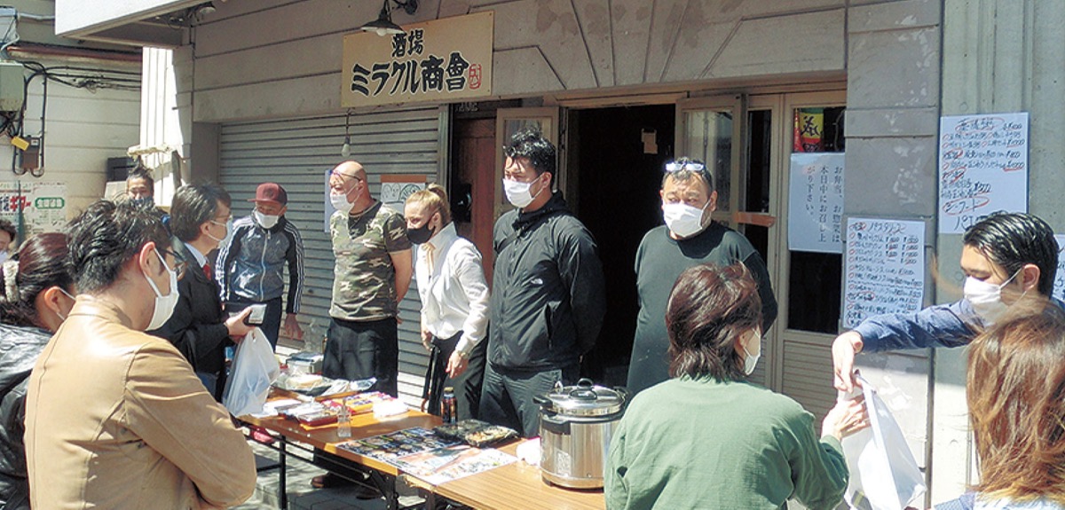 野毛本通り沿いにある『ミラクル商会』の前では週末土日のランチタイムにあわせて、全5店舗が持ち寄ったテイクアウトメニューを販売している=写真。この合同販売は『ブラッスリー ピガール』の店主・井上憲治さんが、仲間の店舗に呼びかけて始めた取組みだ。「気分が落ち込みがちな中、仲間と一緒に販売することでモチベーションが保てている」と井上さん。通りがかりやSNSの情報を見て買いにきたという”野毛ファン”も多く「家でお店の味が楽しめるのが嬉しい。馴染みの店で買うことで少しでも支援になれば」「種類が豊富なのでテイクアウトメニューだけで『はしご』ができそう。大変だと思うけれど頑張って欲しい」と応援する声が聞かれた。GW(ゴールデンウィーク)中(5月1〜4日※荒天中止)も実施予定だという。