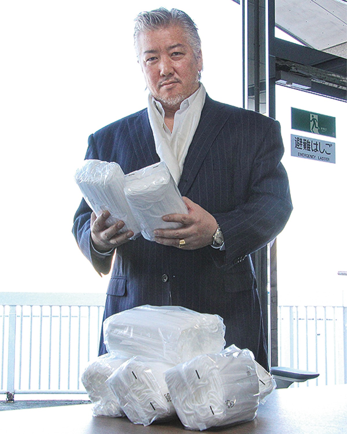 中区山下町でトレーニングジムなどを運営する北井地所グループ代表の北井孝英社長(51)が4月24日、マスク2千枚を一般社団法人横浜港振興協会(藤木幸夫会長)に寄付した。