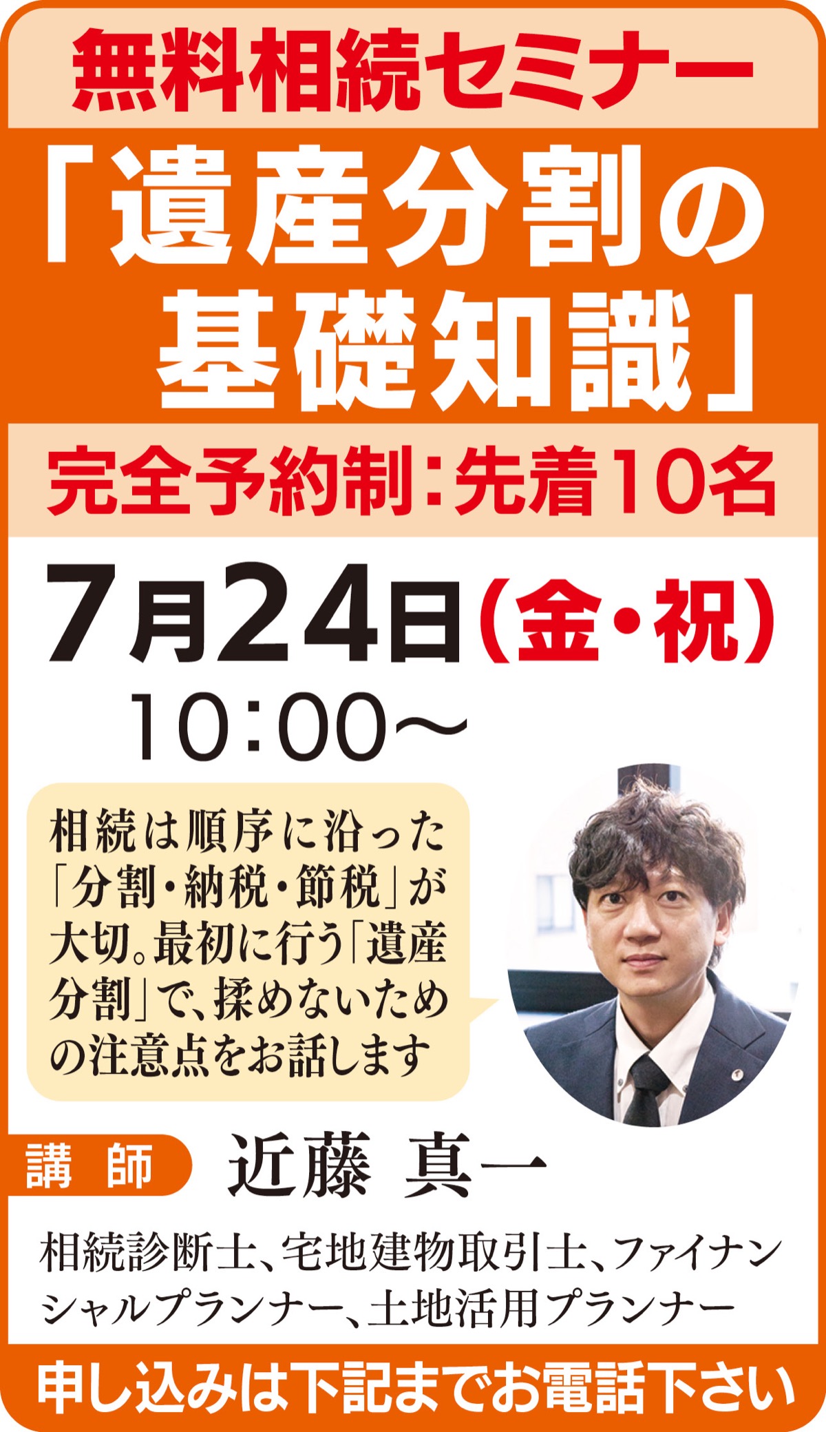 7月24日(金・祝)は「遺産分割の基礎知識」がテーマのセミナーを開催。揉めない遺産分割のために行うべきことは何なのか?相続診断士が分かりやすく説明する。