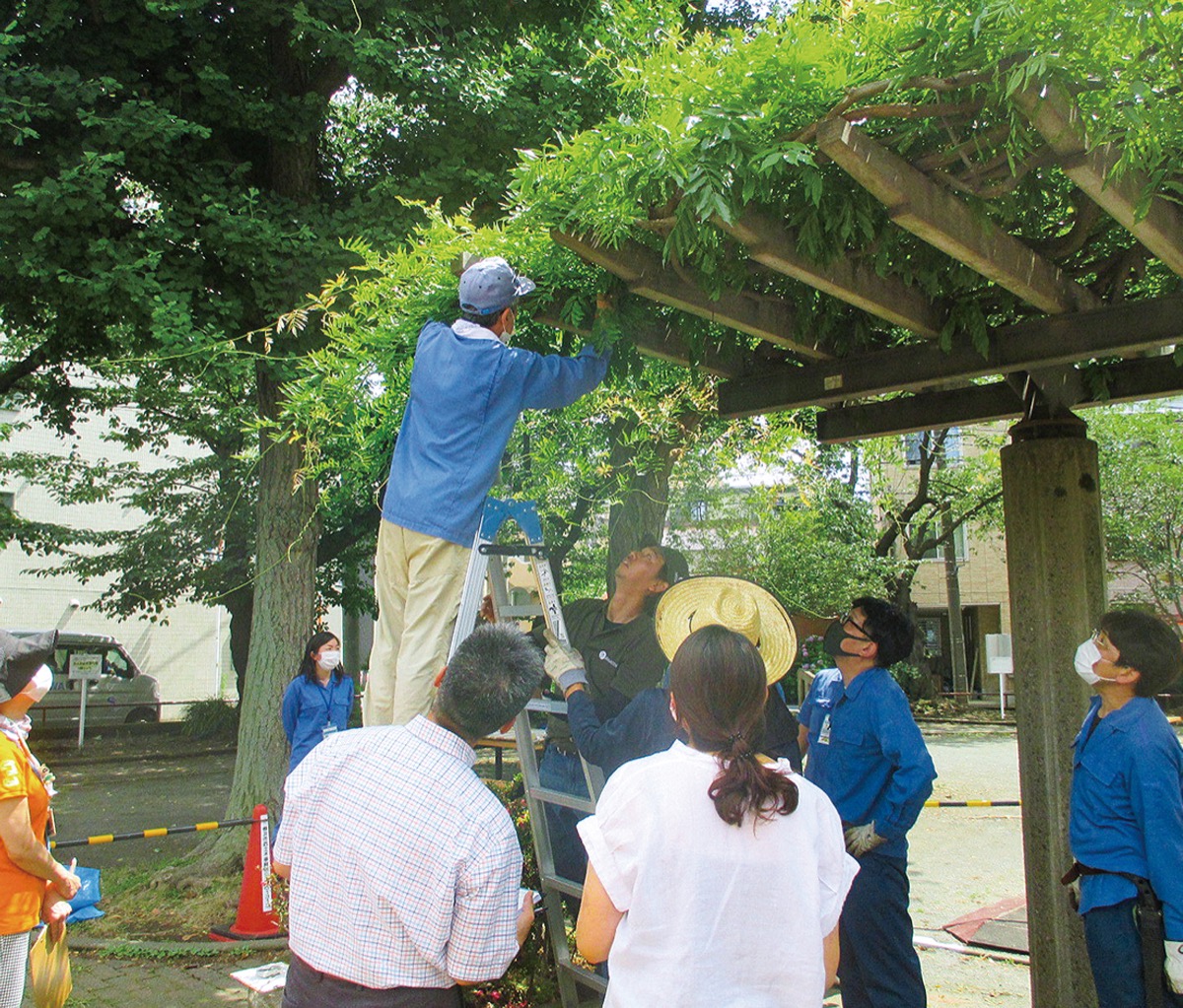 藤棚を再生し、地域のつながりとにぎわい形成につなげたい――。そんなプロジェクトが西区でスタートした。6月23日には、造園の専門家を講師に浜松町公園で剪定(せんてい)作業などの講習会が開かれた。事業を担当する西土木事務所は、地域の住民らと協働で一年かけて区内の8公園にある藤棚を維持管理していく。