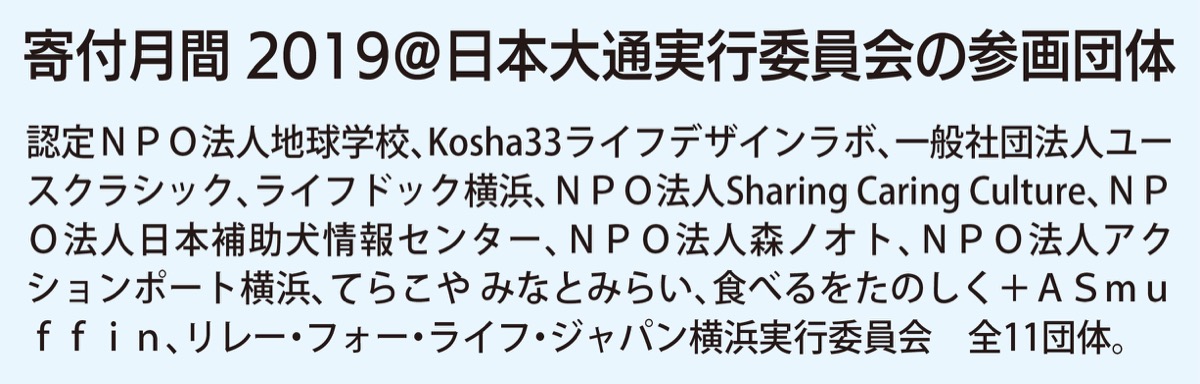 寄付月間の参加は、認定NPO法人地球学校を運営し、16年から同企画に参加している丸山委員長がライフデザインラボで呼びかけたことがきっかけ。同ラボの船本由佳所長と「多様な価値を伝えるために10団体くらいで参加したい」と同ラボのネットワークを活用して協働を促し昨年は4団体、今年で11団体に広がった。