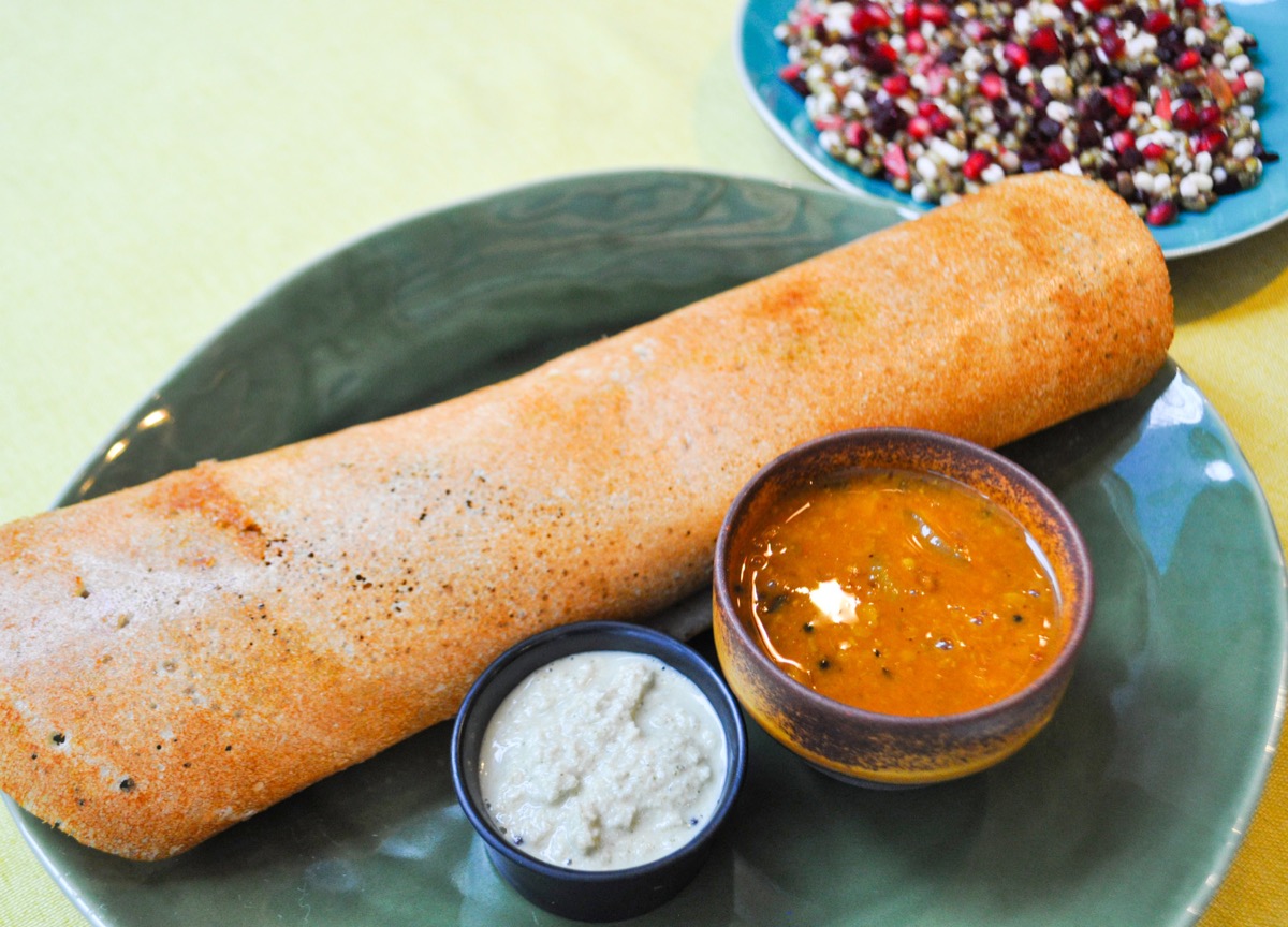 テイクアウトの1番人気は「ドーサ」。お皿からはみ出るほど大きい生地は、数種類の豆とドーサ専用のインドの米粉を発酵させてクレープのように薄く焼いたもの。中にはドライタイプのカレーがたっぷり。スパイス好きにはたまらない味わいです。発酵によるほど良い酸味の生地を具と一緒にちぎって(これが難しい!)、セットで付いている現地レシピの「サンバル」(スープカレー)と自家製「ココナッツチャトニ」をディップしていただきます。個々に食べても抜群に美味しいのに、これをディップに使うとは…。1つのメニューで色々な味わいが楽しめるのもいいですね。からだに良い食材とスパイスのチカラで免疫力がぐんぐん上がっていく気がする…。