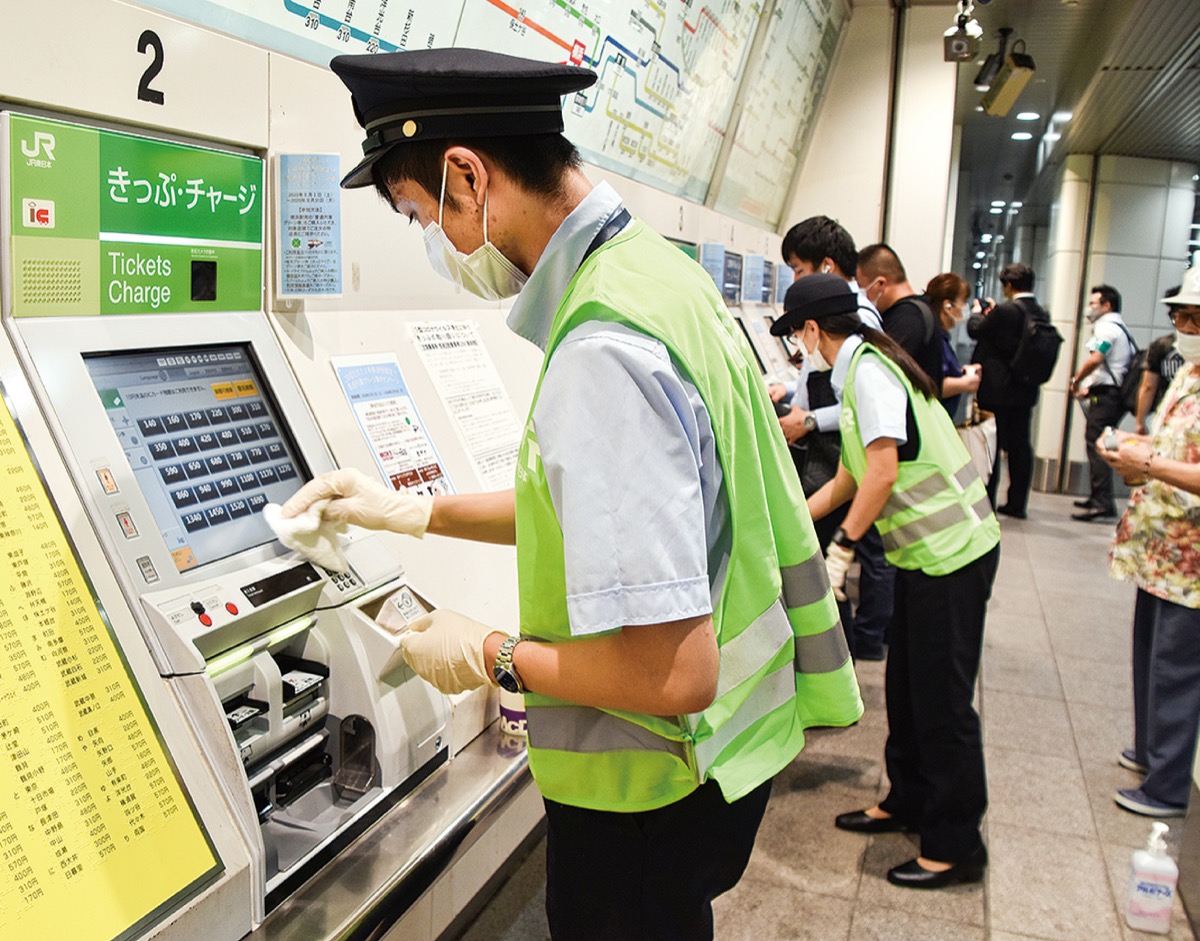 当日はJR横浜駅のホーム全4本を対象に消毒作業を実施。触れる機会が多い券売機やホームドア、手すり、自動販売機、また待合室のベンチなどを消毒液を付けた布で入念に拭っていた。参加した原昭浩駅長(58)は「皆様に安心してご利用いただきたい。今後も職員による消毒作業は適宜、実施していきたい」と話していた。
