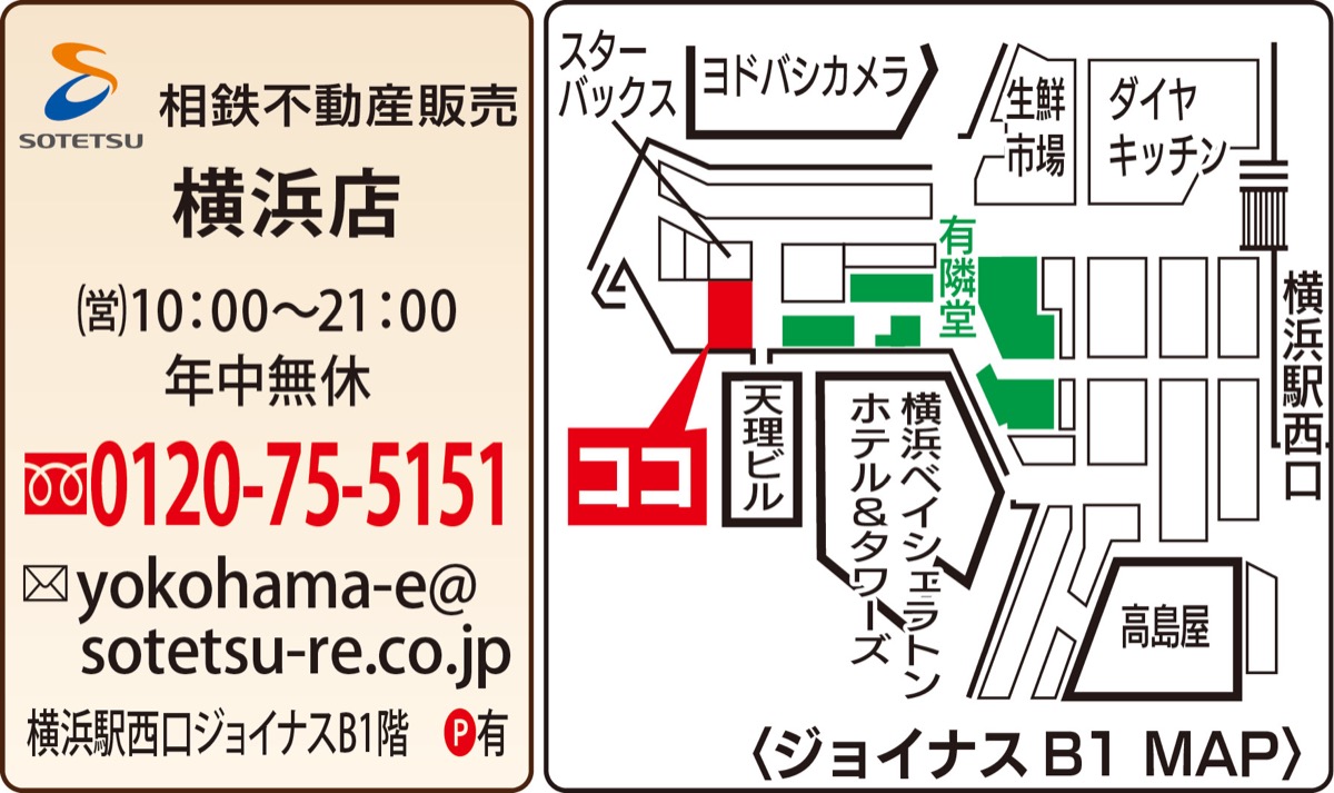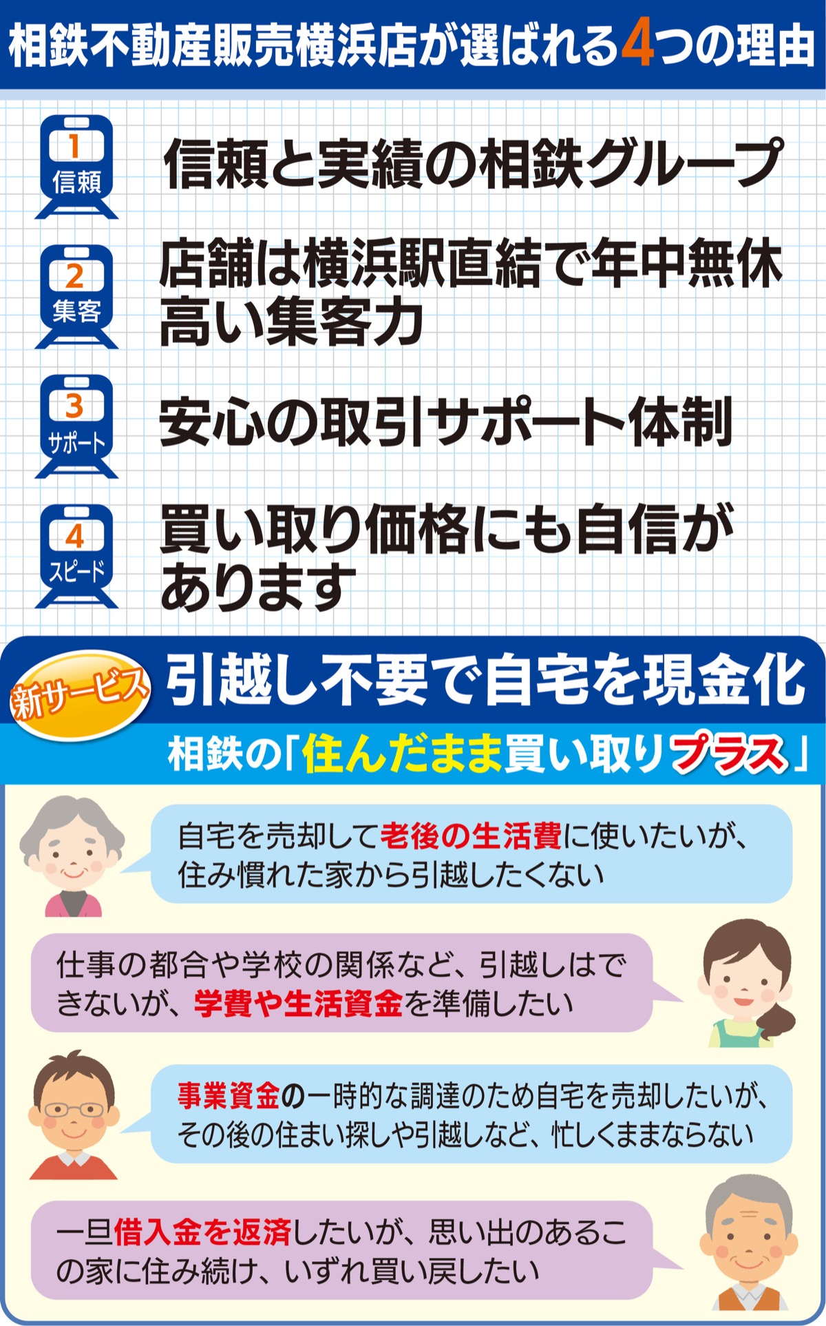 「確実に売りたい」「少しでも高く売りたい」「手間なくスムーズに売りたい」等、不動産の売却を考えている人は相鉄不動産販売(株)横浜店へ。相鉄グループの同社は、グループスタッフ約1万人の総合力と、上場企業を中心に約70社の提携企業とのネットワークを持ち、その強みを活かした高い集客力と販売力を誇る。また、地域に精通した経験豊富なスタッフが多く在籍しているのも魅力だ。まずは気軽に相談を。