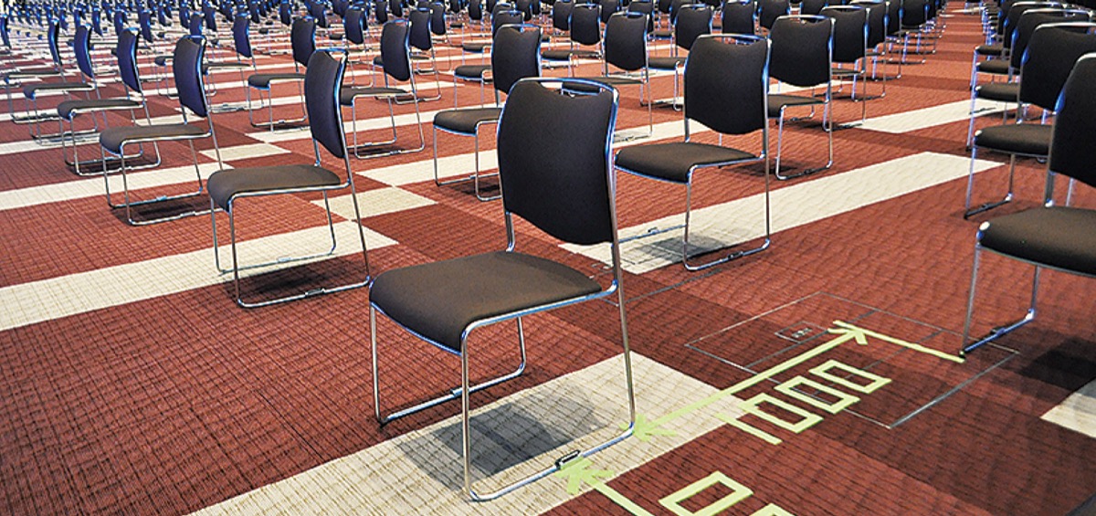 これはコロナ禍によるイベントの人数規制が一部緩和されたことを受け、実施されたもの。施設見学とあわせて、発熱探知のサーモグラフィやソーシャルディスタンスを保った会場レイアウト=写真=、近隣ホテルのケータリングなど、新型コロナウイルス感染症拡大防止の取組みを紹介。安全安心なMICE開催をアピールした。