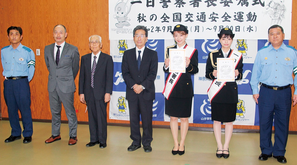 山手警察署(前田俊明署長)は9月24日、秋の全国交通安全運動の一環で歌手・大矢梨華子さんとタレント・高見奈央さんを招き、一日警察署長の委嘱式を開いた。