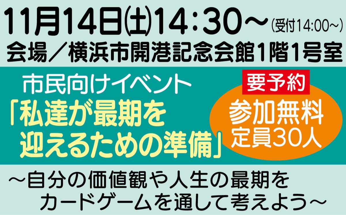 自分の価値観や人生の最期について、カードゲームを通して考えるイベントが11月14日(土)の午後2時30分から、横浜市開港記念会館で開催される。主催は中区在宅医療相談室。
