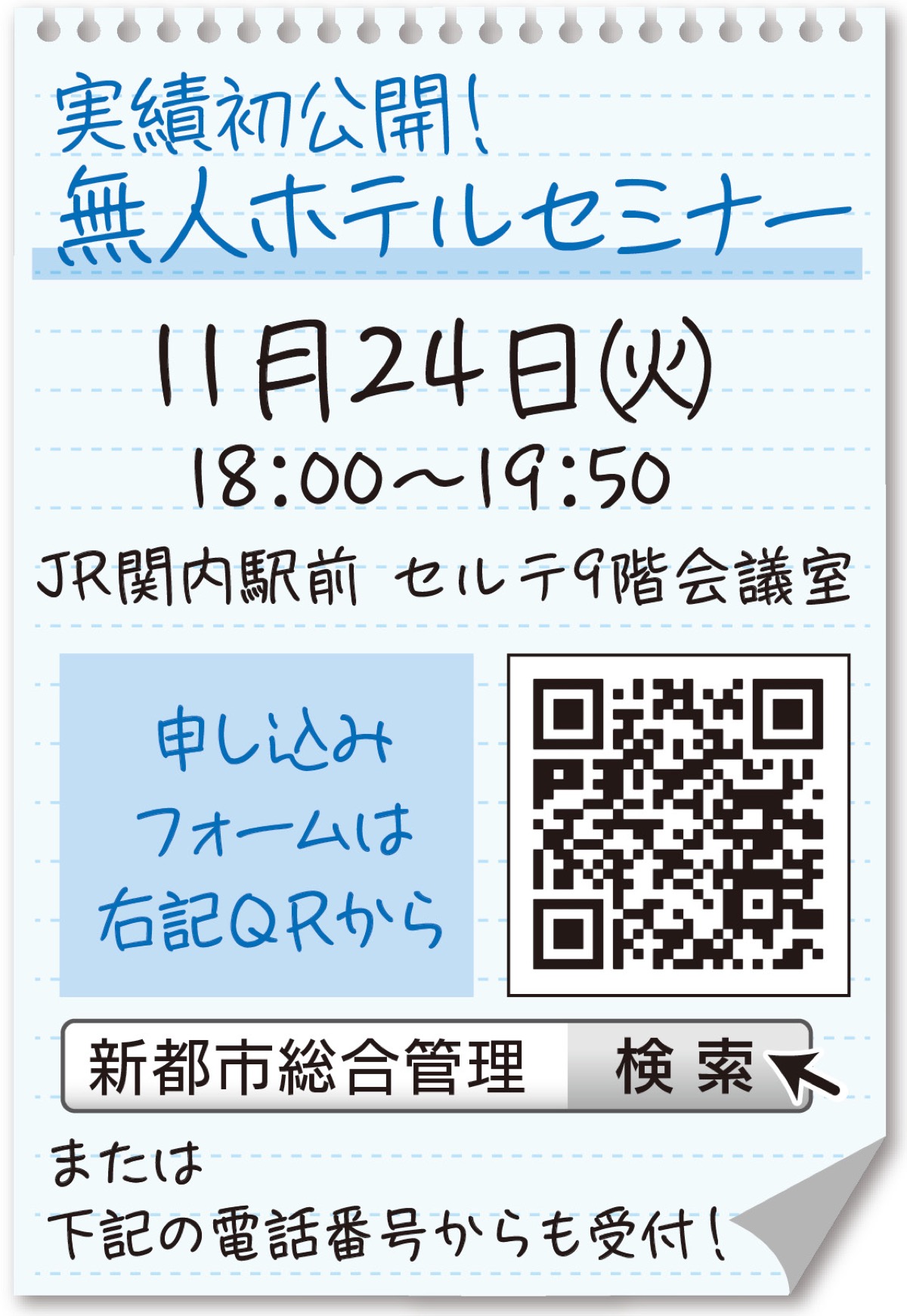 昨年末に横浜初の無人ホテル『GRAND CAVE YOKOHAMA』を、石川町にオープンさせました。しかし今年1月末からコロナの影響により、観光業界は未曾有の大打撃を受けています。そんななか、少子高齢化に伴う人口減少・人材不足の深刻化を控える現代において、省人化を目的として開発された無人型ホテルが、感染症対策可能な非接触型ホテルとして注目され、他業種ホテルよりも高い稼働率を実現しています。11月24日に開催するセミナーでは、無人ホテル事業のスキームと、横浜エリアの稼働状況を公開します。また、今後横浜市中心部で更なる開発を進めていくにあたり、リスク管理されている投資物件のご紹介もいたします。無人ホテル、民泊、不動産投資などに興味をお持ちの方は、是非ともご参加ください。