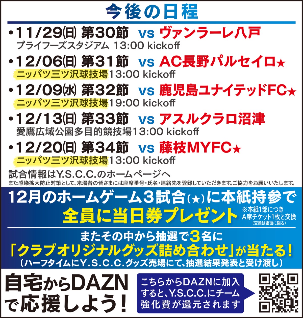 残るはあと5節。12月6日(日)、9日(水)、20日(日)にはホームゲームが3戦、見逃せない試合が続く。宮尾キャプテンは「ここまで結果で応えることがなかなかできず、遠ざかっていたからこそ、喉から手が出るほど勝ちたい。みんなで喜びを分かち合いたい。勝って楽しくサッカーをしている姿を皆さんに見せ、最後まで感謝を伝えていきたい」と意気込んだ。