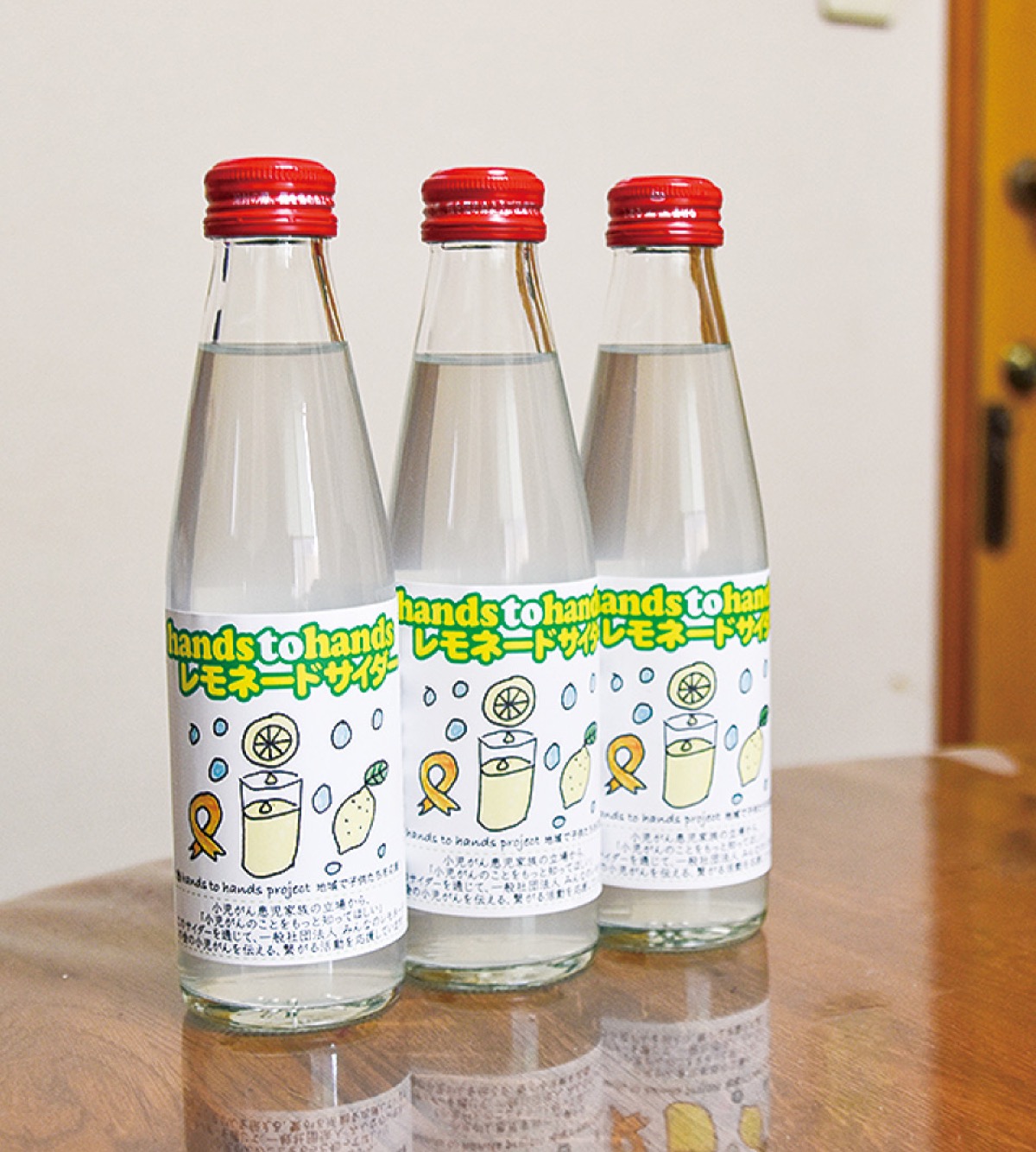 この活動を手掛けるマルニ商店の栗原清剛さんは、今回、子どもたちの健康に焦点をあて、小児がんの啓発を目的にレモネードスタンド活動などを行う地元の団体、(一社)みんなのレモネードの会支援を計画。同会の中心メンバーで、脳腫瘍を克服し今も治療を続けている岡野中学校1年の榮島四郎さんに、サイダーのラベルデザインを依頼した。四郎さんは、これまでにも小児がんの闘病体験などを紹介した絵本『ぼくはレモネードやさん』を出版しており、絵本作家の顔を持つ。サイダーの売上の一部は小児がん啓発普及に役立てられる。榮島さんは「たくさんの人たちに飲んでもらって、小児がんのことを知ってもらえたら嬉しいです」と話す。