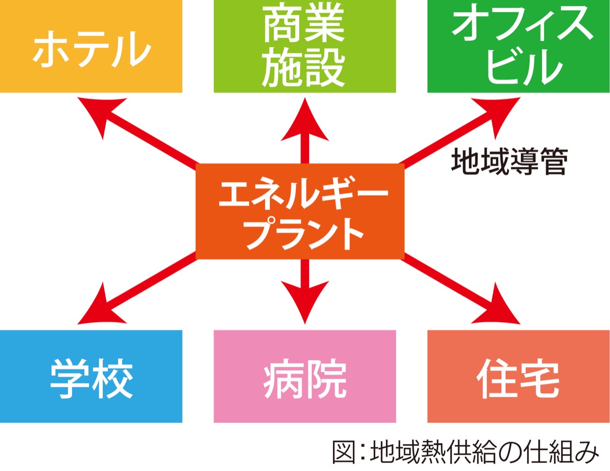 熱供給事業とは「加熱され、もしくは冷却された水または蒸気を導管により供給すること」と法律で定義されている。冷暖房や給湯に使う冷水や蒸気を大型機器が入るプラントで一括製造。地域内にある住宅やホテル、商業施設などに地域導管を使って24時間365日供給する仕組みだ。